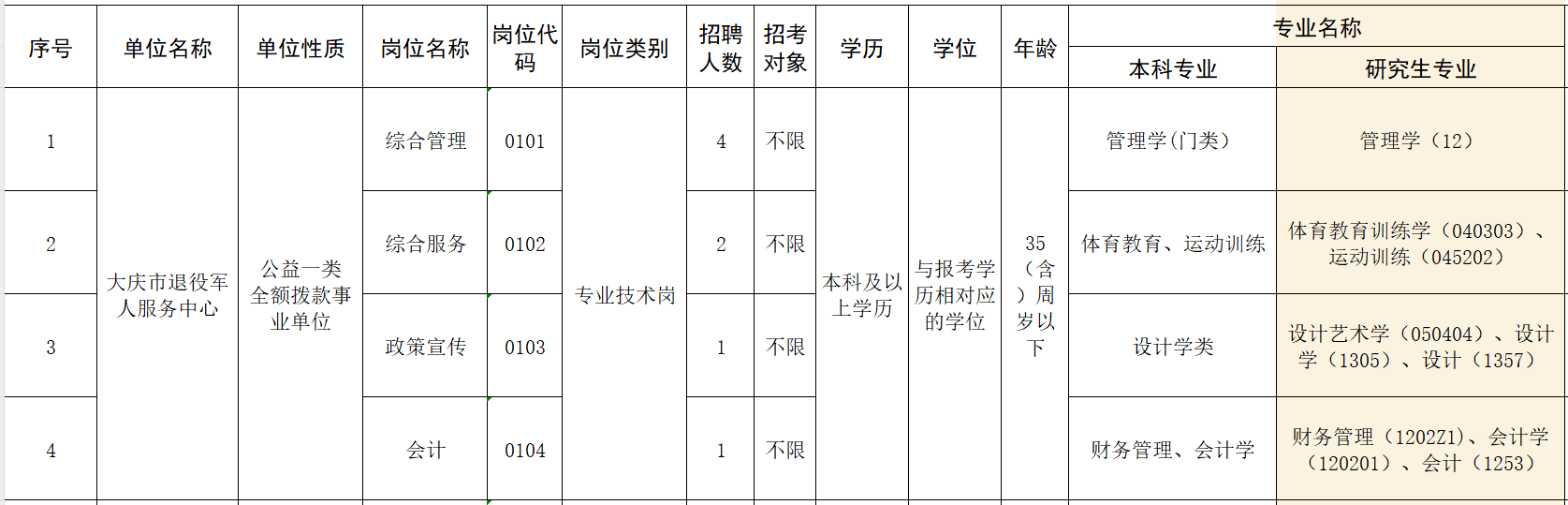 計(jì)劃公開招聘9名工作人員,其中大慶市退役軍人服務(wù)中心8名、大慶市軍用飲食供應(yīng)站1名。(詳見《2023年大慶市退役軍人事務(wù)局所屬事業(yè)單位公開招聘崗位計(jì)劃表》)(附件1)